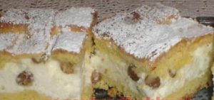 Na první vrstvu naneseme krém, rovnoměrně rozetřeme a přikryjeme druhou vrstvou. Pečeme v troubě 35 minut při 180 stupních. Vychladlý dezert posypeme moučkovým cukrem.